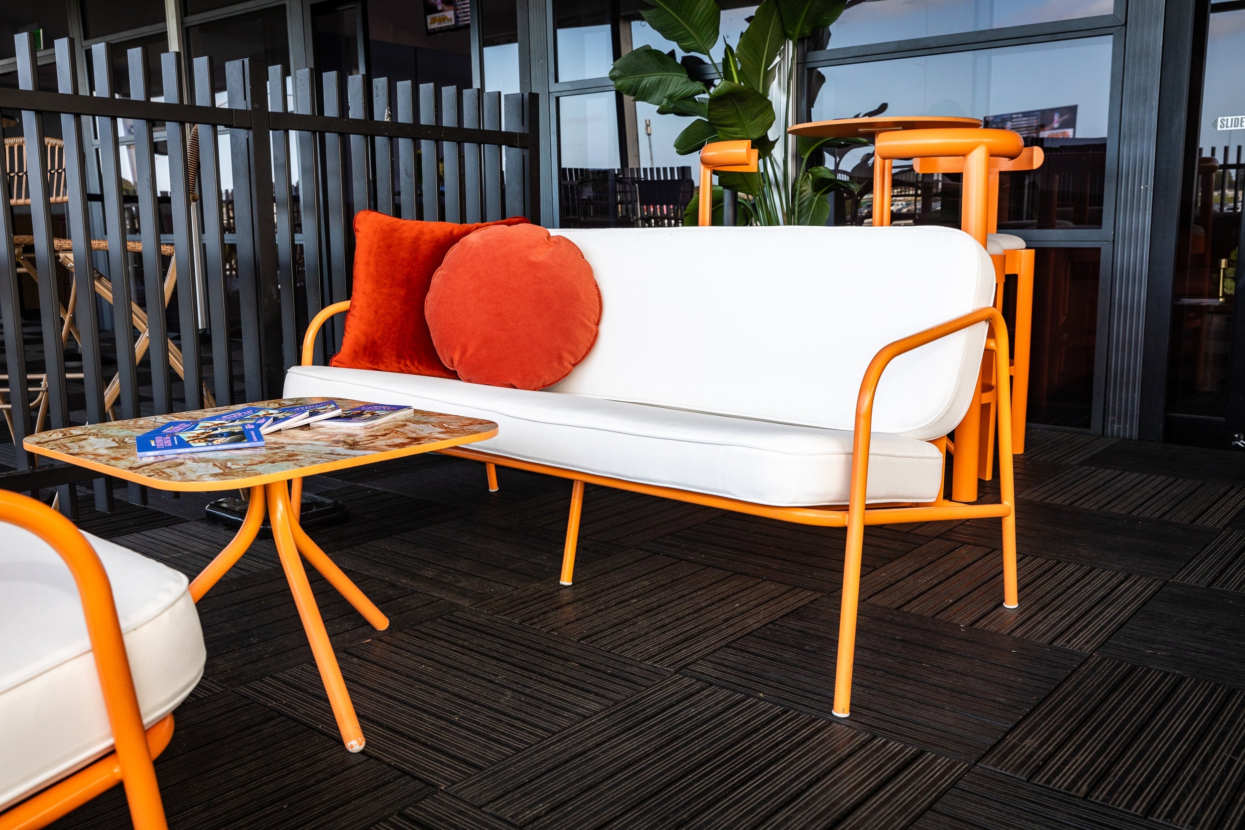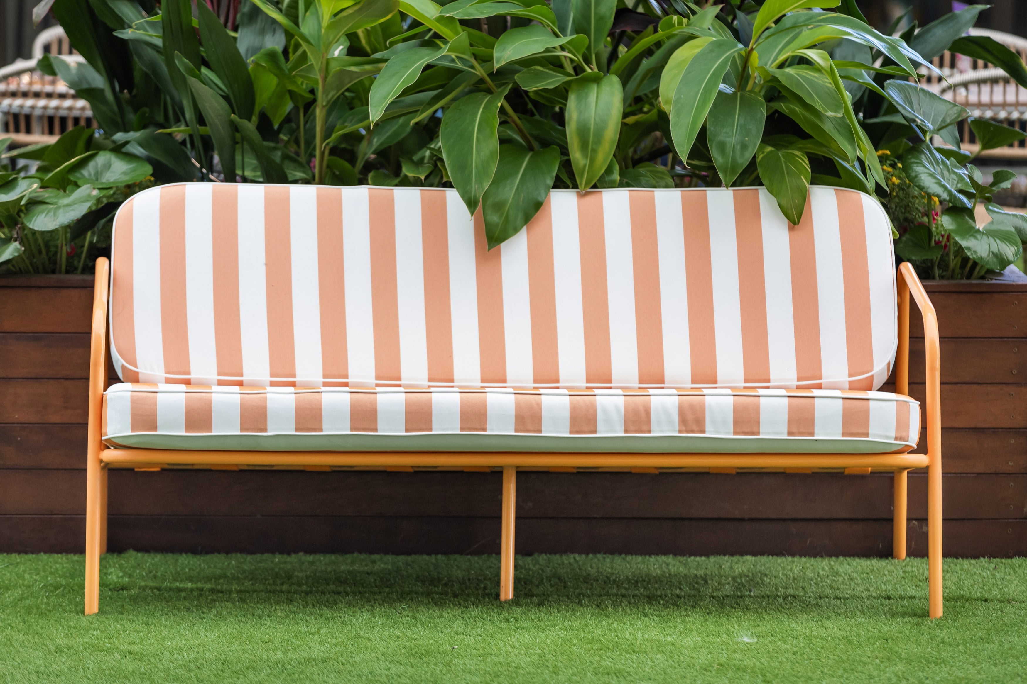 Stimulating and chromatic, this retro outdoor collection in armchair and lounge exudes energy and excitement. Four summer sorbet shades in asymmetrical hues with complementary weave detail create a layered foundation for interchangeable cushions featuring distinctive patterns with rolled pipe edging.