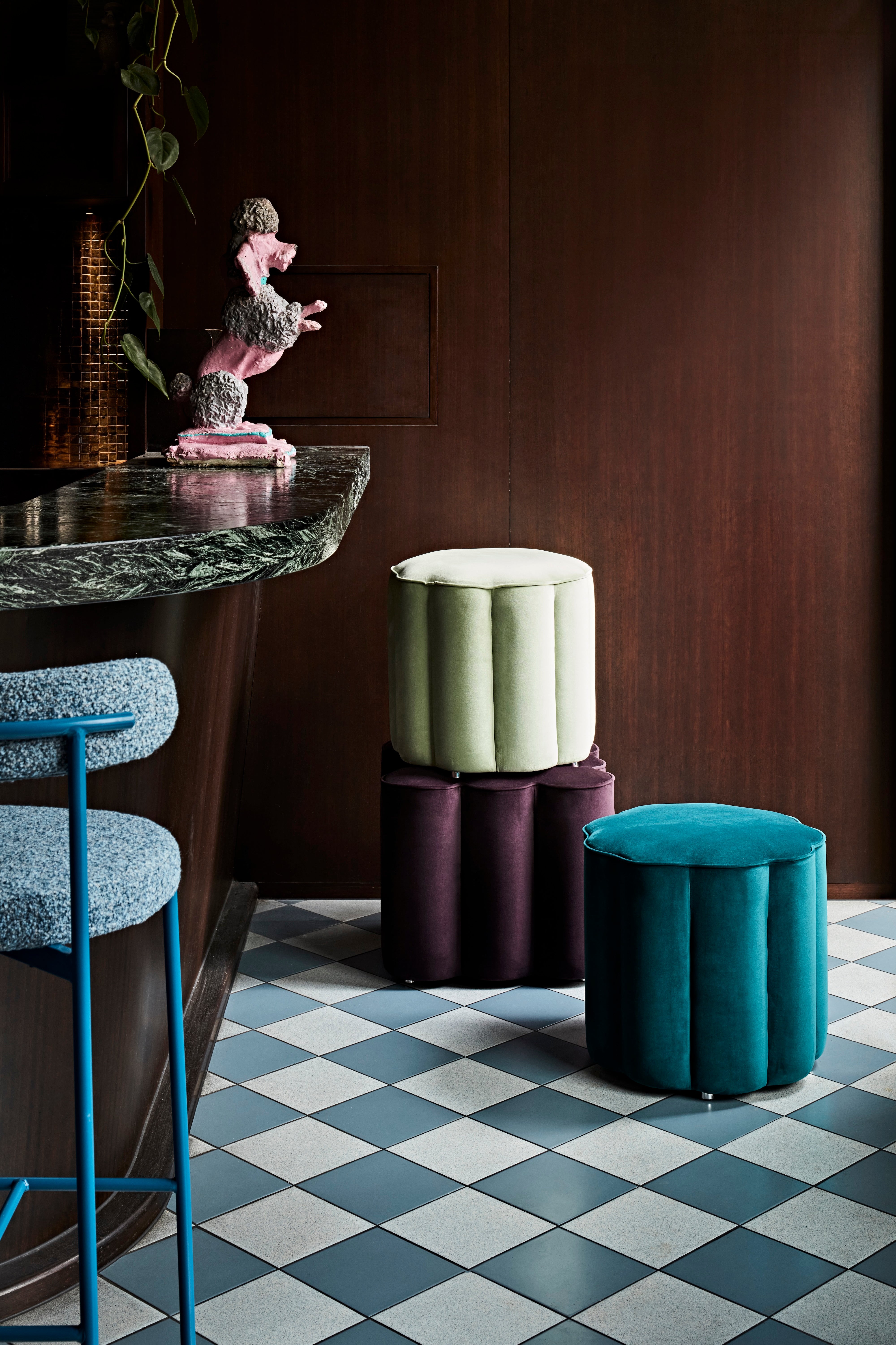 Alluring and classically re-formed, the scallop shaped Rosetta ottomans – with vertical tufting in emboldened jewel tone velvets including raspberry, midnight plum and mink brown – embody the intrigue of sophisticated living with a flourish of decadence.