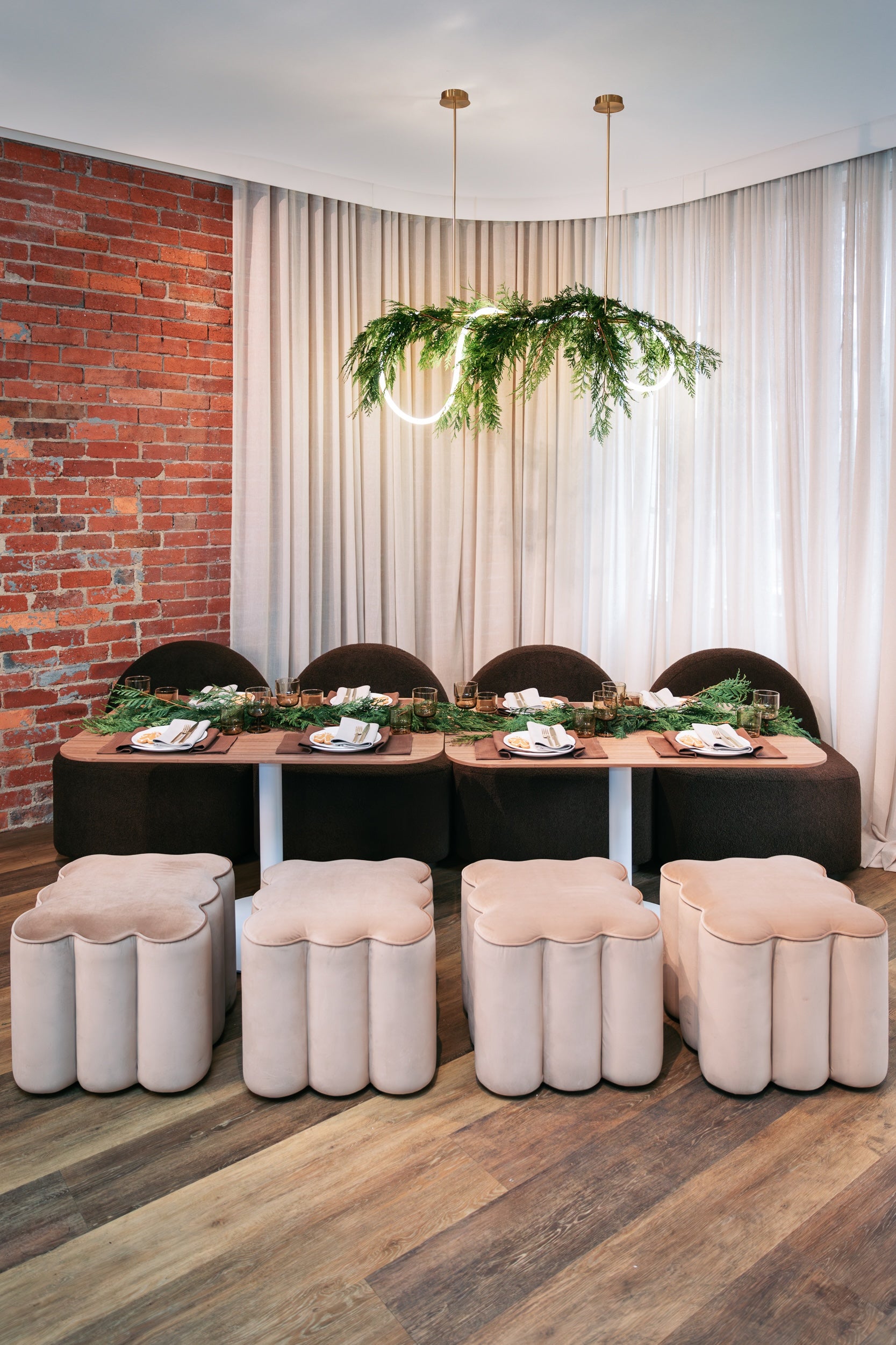 Alluring and classically re-formed, the scallop shaped Rosetta ottomans – with vertical tufting in emboldened jewel tone velvets including raspberry, midnight plum and mink brown – embody the intrigue of sophisticated living with a flourish of decadence.