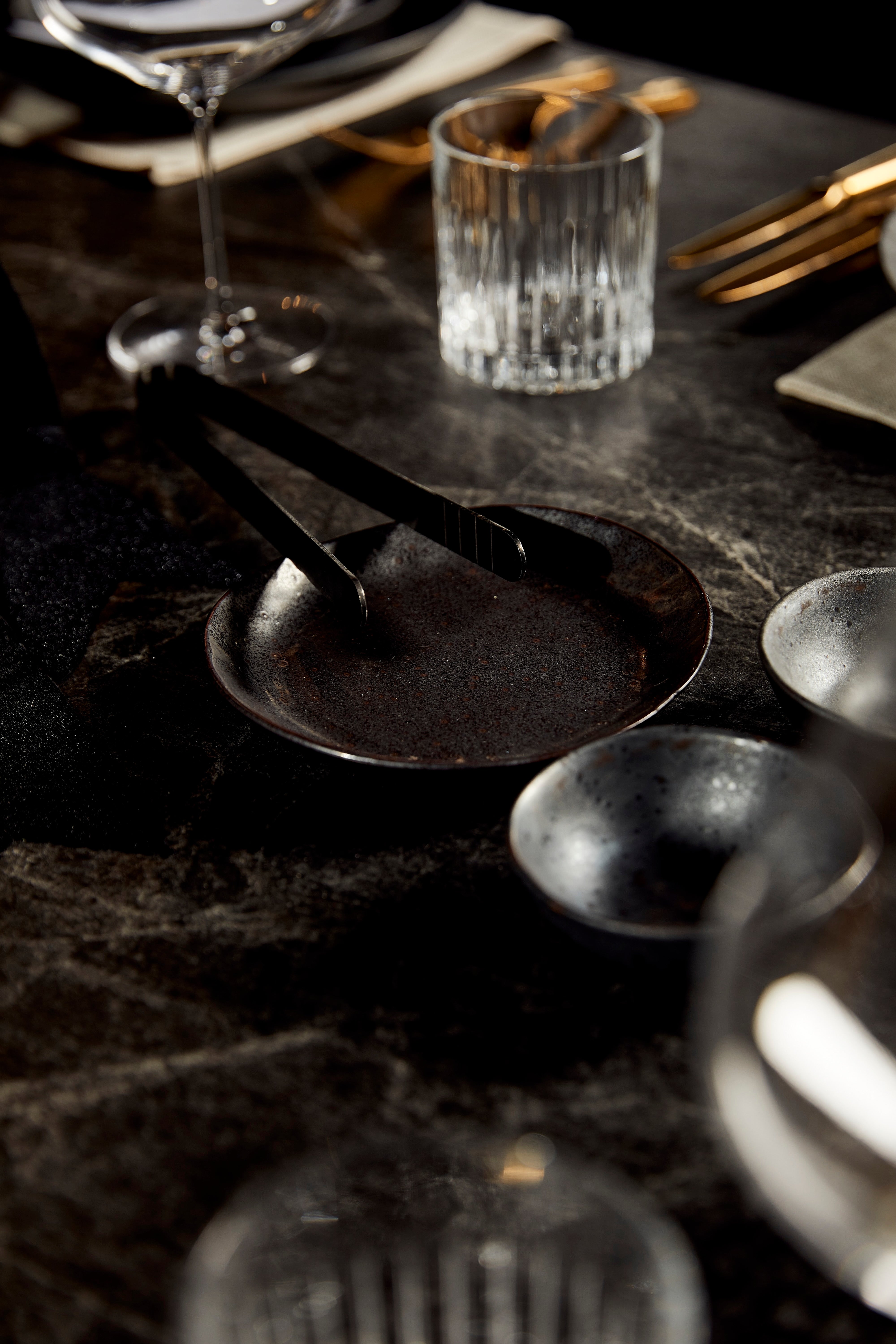A versatile and dramatic style, the Slate range is distinctive in its organic shape and textured, deep hues of mottled charcoal glaze.